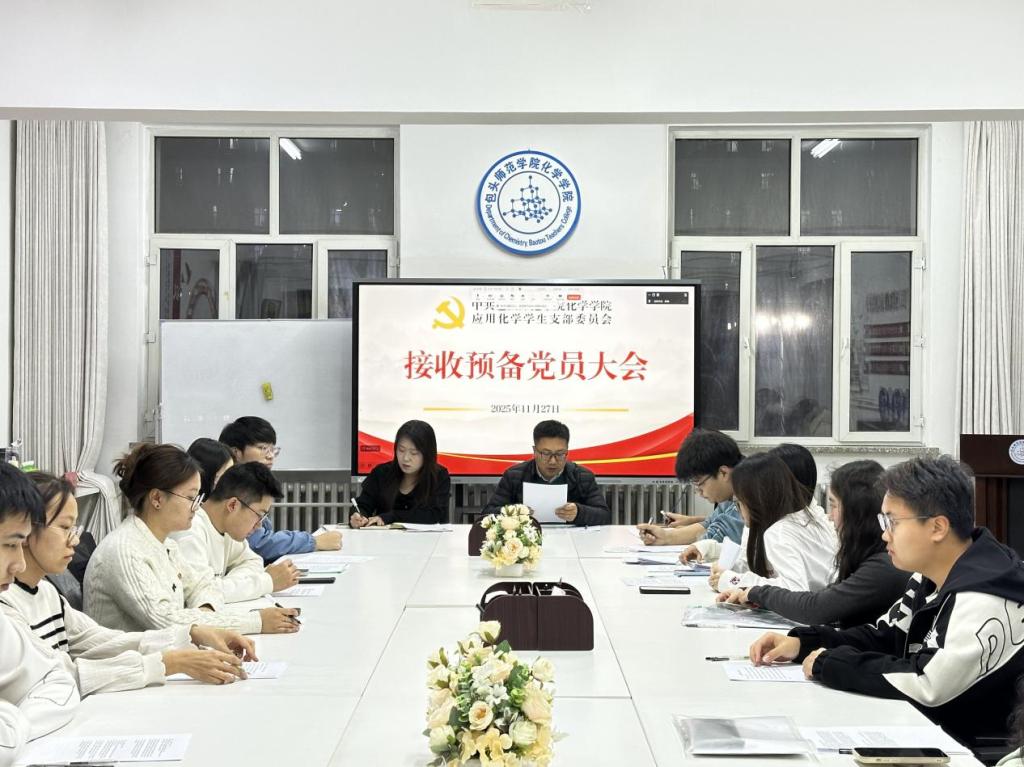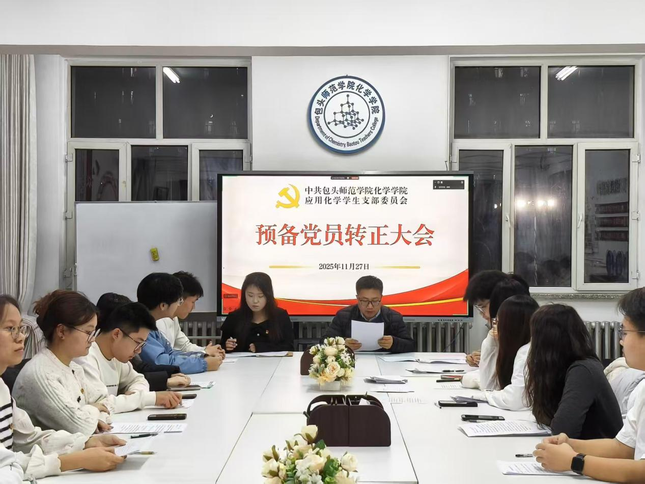 2025年11月27日,中共包头师范学院化学学院应用化学学生党支部于齐志楼317会议室召开党员大会,讨论接收预备党员及预备党员转正事宜。化学学院党总支组织委员徐向明同志,支部全体学生党员(包括6名待转正预备党员),以及12名发展对象参会。