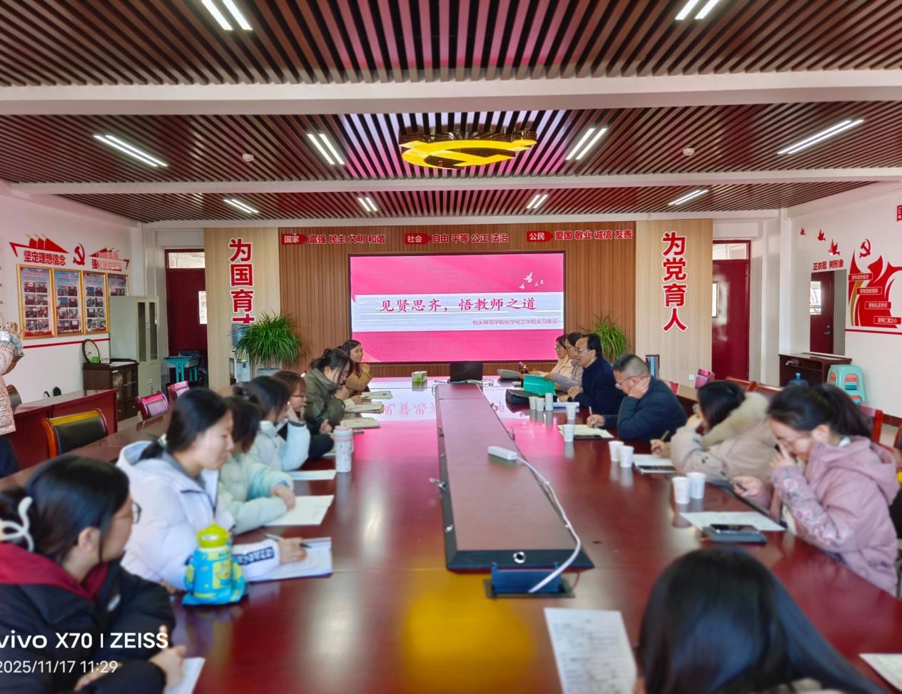 随后,走访组与东联中学校领导、化学教研组全体教师及实习学生共同开展评课与座谈活动。座谈中,东联中学化学教研组组长详细介绍了该校对实习生的培养计划,从备课指导、听课、磨课到班级管理实践,形成了全方位的带教体系。指导教师们普遍评价包头师范学院实习生“态度踏实、肯于钻研、适应能力强”,在辅助教学和课外活动组织中发挥了积极作用。张娟及其他实习生分享了实习以来的感悟,纷纷表示在指导教师的“一对一”带教下,自身教学设计与课堂把控能力得到显著提升。贾倩南主任结合学生发言,就教学重难点突破、学情分析方法等问题与教研组教师展开深入研讨,为后续实习指导工作精准施策。