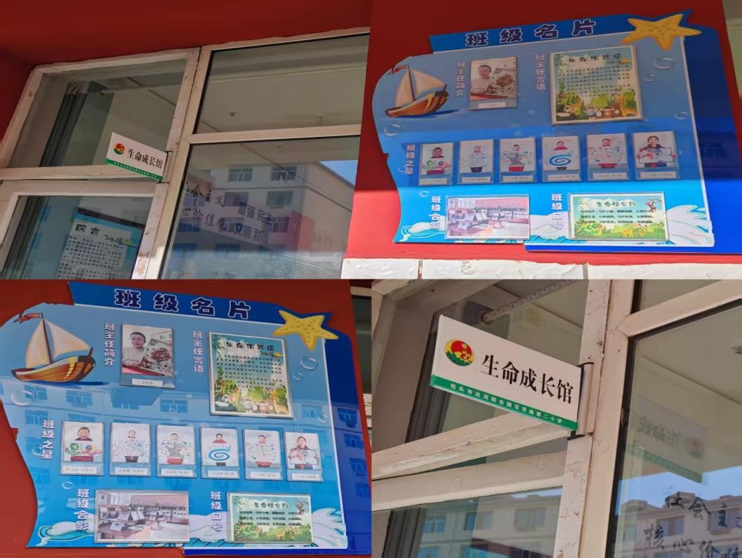 空间设计处处体现教育智慧与边境文化交融。黑板与软木板上的标语“带着孩子们来到思考和言语的源头——大自然去”引用了苏霍姆林斯基的教育箴言,阶梯式展架既满足展示需求,又形成灵活的互动空间。窗边陈列的绘画作品与窗外悬挂的班级名片墙,则展现了“班级之星”的成长风采,记录着学生参与生命馆建设的点滴故事。班级公约中“轻步轻声守护宁静”“慧眼观察文明互动”等条款,更将自然教育与品德培养有机结合,融入内蒙古人尊重自然的传统理念。