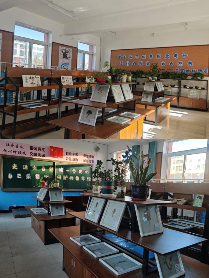 这间由支教实习生设计的生命教育空间,以“自然即课堂”为理念,精心布置了多层次的生命观察区:从孵化箱中破壳而出的芦丁鸡、灵动活泼的仓鼠与乌龟构成微型动物世界;错落有致的生态花架上,绿意盎然的植物与学生们亲手制作的植物标本相映成趣。据支教学校领导介绍,馆内作品均由实习生带领学生采集、制作,50余件作品完整呈现了动植物生命周期的奥秘,其中不乏当地特有的耐寒植物标本,彰显边境生态特色。